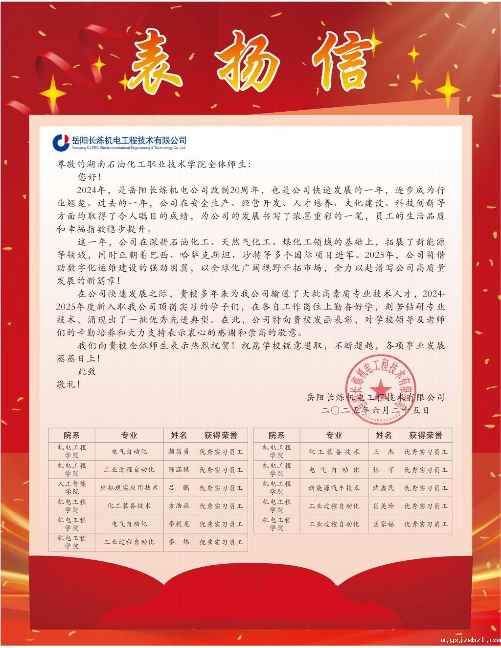 本网讯 6月25日,岳阳长炼机电工程技术有限公司向我校全体师生发出一封热情洋溢的表扬信。信中提到,我校2024-2025年度新入职公司的岗位实习学子们,在各自工作岗位上勤奋学习、刻苦钻研专业技术,涌现出一批优秀先进典型,特发函表彰。此次表彰不仅是对我校优秀学子的肯定,也彰显了我校人才培养质量的成效,充分体现了校企合作在人才培养、技术创新方面的积极作用。学校将继续深化产教融合,为社会培养更多高素质技术技能人才。